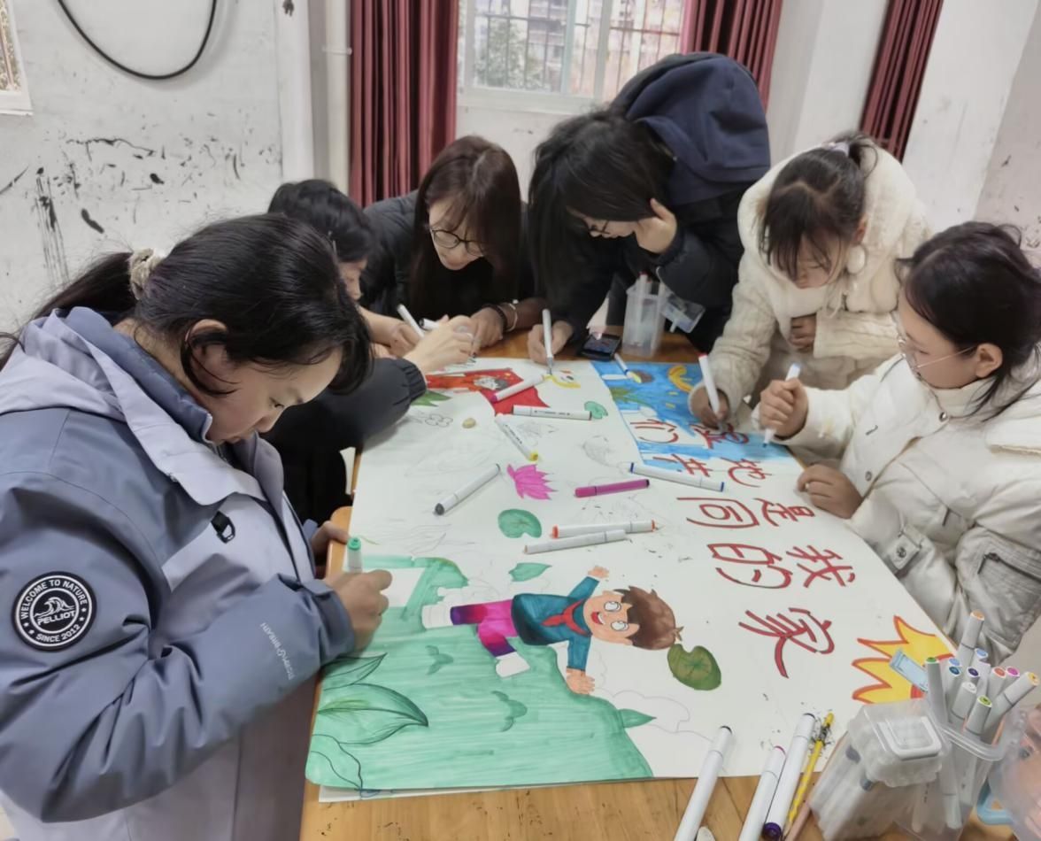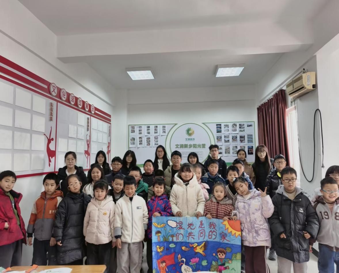 下午时段,实践团聚焦作业答疑与湿地主题海报创作。作业辅导针对员工上午遗留的学习疑惑展开集中讲解,进一步提升了学习效果。14:40 起,员工们进入海报上色与细节完善阶段,孩子们使用水彩笔、彩铅等工具,为上午绘制的线稿填充色彩。实践团成员在旁指导配色技巧,鼓励孩子们大胆运用色彩表达对自然的热爱。15:50 后,海报制作进入收尾与展示环节,孩子们在支教团协助下,为海报添加文字标语、装饰边框,并集体讨论确定最终版面布局。完成创作后,实践团与员工们一同举起 “保护湿地” 主题海报,在教室中展示并合影。孩子们手持作品,笑容灿烂,尽显满满的成就感与环保意识。