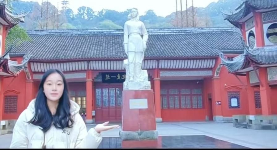实践队抵达赵一曼纪念馆后,首先来到馆前广场。队员们在赵一曼烈士汉白玉雕像前驻足留影,雕像身姿挺拔、神情坚毅,背景是朱红飞檐的纪念馆正门,队员们将革命先辈的精神力量融入青春记忆,立志传承红色星火。