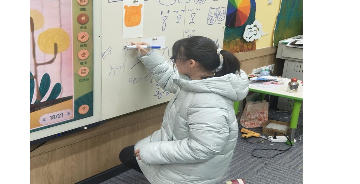 与此同时,在美术班,毕艾嘉协助教师开展课程引导与互动练习,按照“艺术知识+素养知识”双螺旋教学要求,指导学员掌握绘画技巧,鼓励学员发挥想象力进行个性化创作。课前提前布置教室、准备绘画工具,课后协助教师整理学员作品,参与学员学习情况点评,耐心解答学员疑问,陪伴学员在创作中感受艺术魅力。