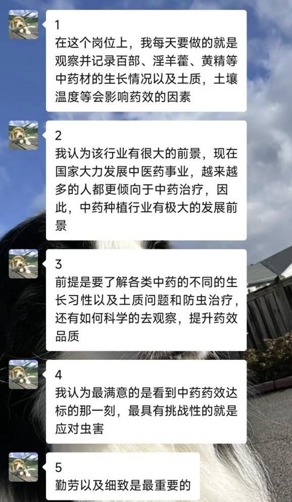 通过线上的方式,小队成员与刘坤林取得了联系。在种植田垄间,刘坤林一边手持记录册细致观察植株长势,一边监测着土壤温度、判断土壤湿度,这就是他的日常。谈及行业前景,刘坤林眼中满是期待:“国家对中医药事业的扶持力度越来越大,大众对中药治疗的认可度也在提升,这个行业未来大有可为。”但他也坦承,当前部分商家以次充好、用劣质药材替代正品的行为,加剧了消费者对中药的顾虑,这是行业发展需共同破解的难题。我们认真记录着每一个要点,提出自己的疑问,在一问一答间,对农业相关职业的认知也逐渐变得清晰起来。