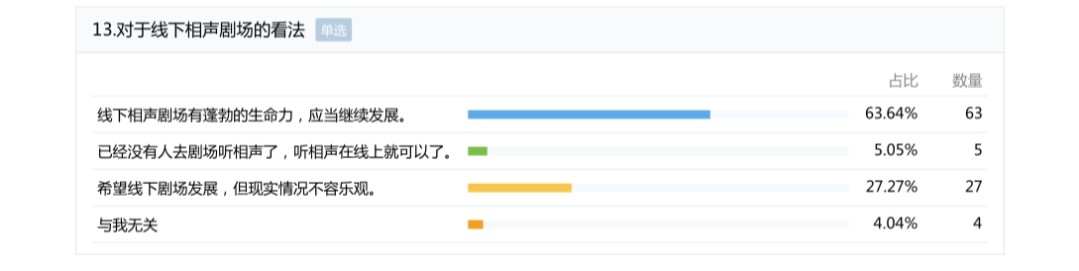 这与线下剧场的供应不足有重要关系。根据本次调查中反映出来的情况,团队成员发现四川只有零星几个地区会有相声演出,主要集中在省会成都,小县城几乎没有,成都的相声剧场也仅有两三家,重庆地区也是如此,这严重阻挡了川渝人民近距离感受相声魅力的脚步。虽然相声受众的年轻化要求我们注意线上平台的发展,但线下剧场更能释放观众的热情,也能让观众对相声有更直观的认识,反馈中91%的受访者都支持川渝地区线下相声剧场的发展就是对此最好的证明。