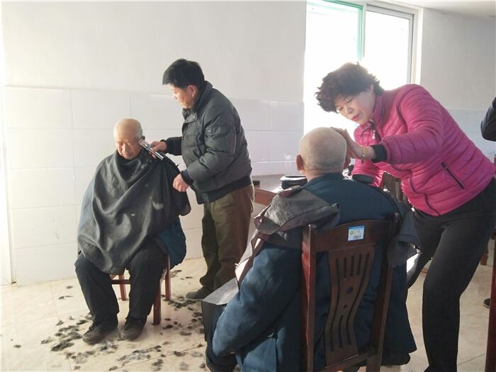 在2月2日去往商河许商街道办事处敬老院后团队在2月4日进行回访。2月4日,正是北方小年。团队来到敬老院就感受到了浓浓的节日氛围。敬老院的护理人员将老人推到院子里晒太阳,为晒太阳的老人们理发。理发期间,团队成员围坐在老人身边与他们聊天。后来,成员回访了老奶奶。从与老奶奶的交谈中了解到,老奶奶身体很好,胃口很棒。令成员高兴的是,在一进入房间的时候她就认出了成员们。她询问队员有没有吃过饺子,嘱咐队员小年应该吃饺子,还高兴地说道她已经换上了红色的衣服。团队成员也参与了爷爷们的“麻将局”,爷爷们也热情地与团队成员进行合影留念,留下了许多珍贵的照片。