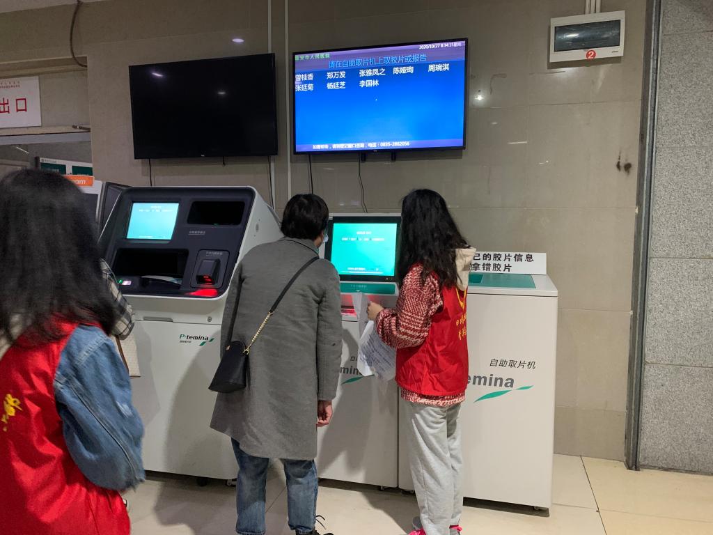 一楼的志愿者协助医护人员引导患者及家属扫描健康码,积极响应疫情防控的相关要求;负一楼和二楼的志愿者则帮助就诊患者使用自助打印机打印胶片和报告单。虽然事情很小,但是几个小时过去足以让他们疲惫不堪。然而整个服务过程中,志愿者们都耐心地帮助患者及其家属,解决他们的问题,没有任何抱怨。志愿者们还亲切地与患者和其家属进行交流沟通,缓解了他们在等待过程中产生的焦急迷茫等负面情绪;除此之外,他们也主动地为迷路的人指引方向,帮助老人和小孩使用电梯。医院的每一个角落,都是他们忙碌的身影和甜美的微笑。