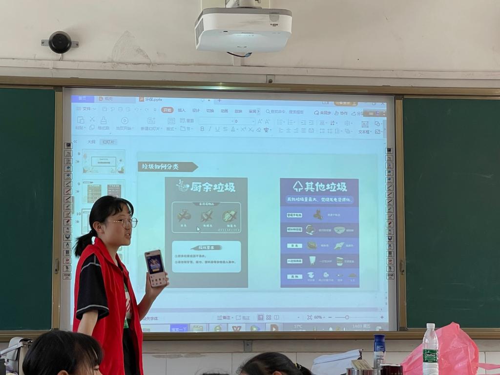 中午12:40,四名志愿者乘车提前到达活动目的地。然后大家进行了合理的分工:两人讲授PPT,两人维持课堂纪律。活动伊始,课堂气氛便十分活跃,同学们积极配合老师的教学,积极回答问题,让教与学真正融合。志愿者老师依次从“为什么要进行垃圾分类”、“垃圾分类的意义”、“垃圾如何分类”、“垃圾分类考考你”四个板块进行讲解,让同学们充分认识到垃圾分类的重要性。在此过程中,老师者老师辅之以妙趣横生的视频和音乐,从而引发同学们的听课热情和兴趣,使课堂洋溢着轻松与欢乐的气氛。在最后的“垃圾分类考考你”环节,老师以问答形式与同学们进行互动,以便检验和巩固他们的学习成果。同学们都积极举手回答问题,并且多数回答正确,说明他们对环保知识已经有了更多的了解,其学习效果显著。