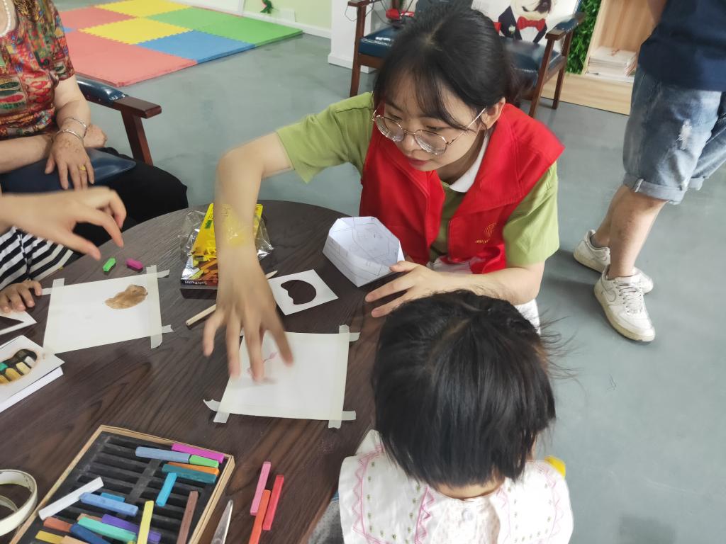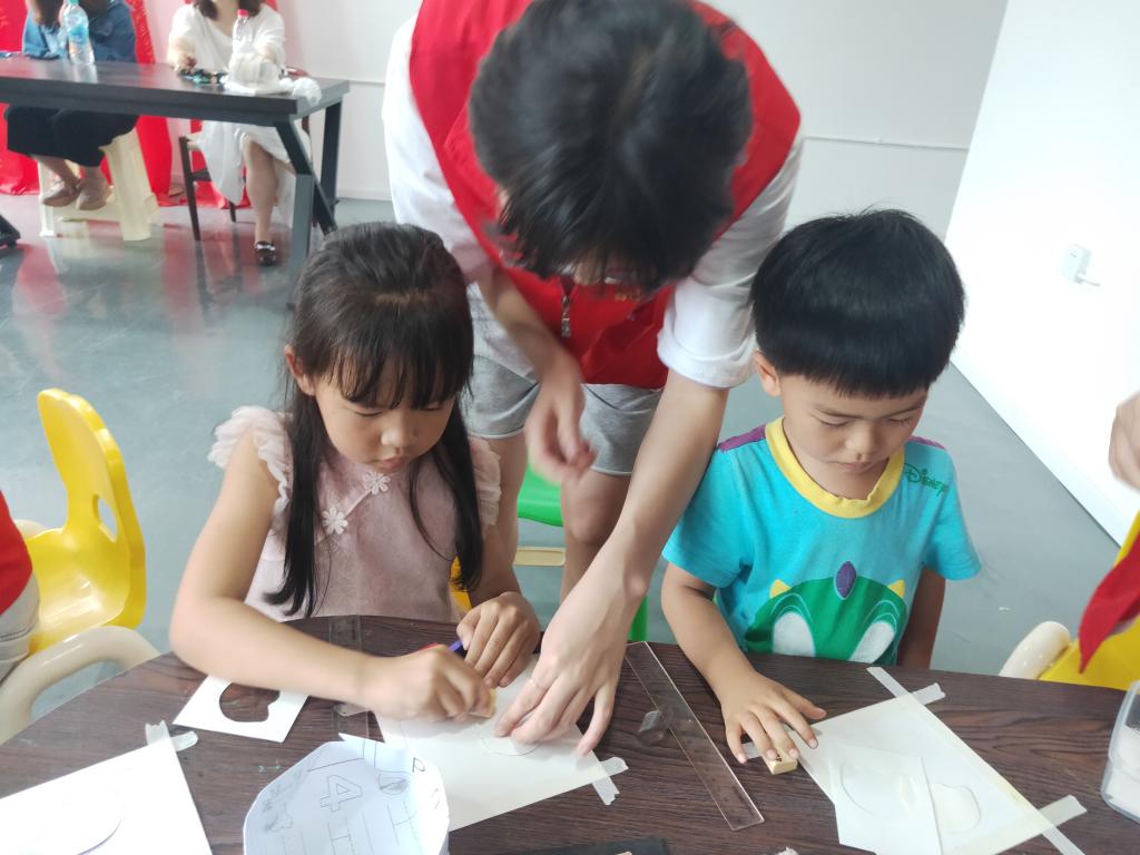 活动伊始,公司志愿者和社区志愿者亲切地进行了交流,互相熟悉,为活动的开展奠定了良好的氛围。社区志愿者向公司志愿者讲解了本次课程的安排,以及在课程中的注意事项。前期由人文志愿者协助社区工作人员进行场地布置,在社区活动室用桌椅围成了一个圈,安排家长及小朋友有序入座;中期,社区志愿者以“老师说”的小游戏进行了本次活动的开展,旨在锻炼小朋友们的注意力,同时维护课堂的秩序,吸引了小朋友们尽快投入到课堂之中,形成了良好的师生互动。同时,人文志愿者积极帮助他们贴画纸、剪模板,为粉彩画课程的开展提供了基础。课程开展过程中,人文志愿者不仅细心指导小朋友们进行粉彩绘画,手把手地耐心帮助小朋友们完成绘画过程中的难点,还协助社区志愿者及老师维护课堂纪律,让粉彩画课堂在活跃轻松的环境中顺利进行。