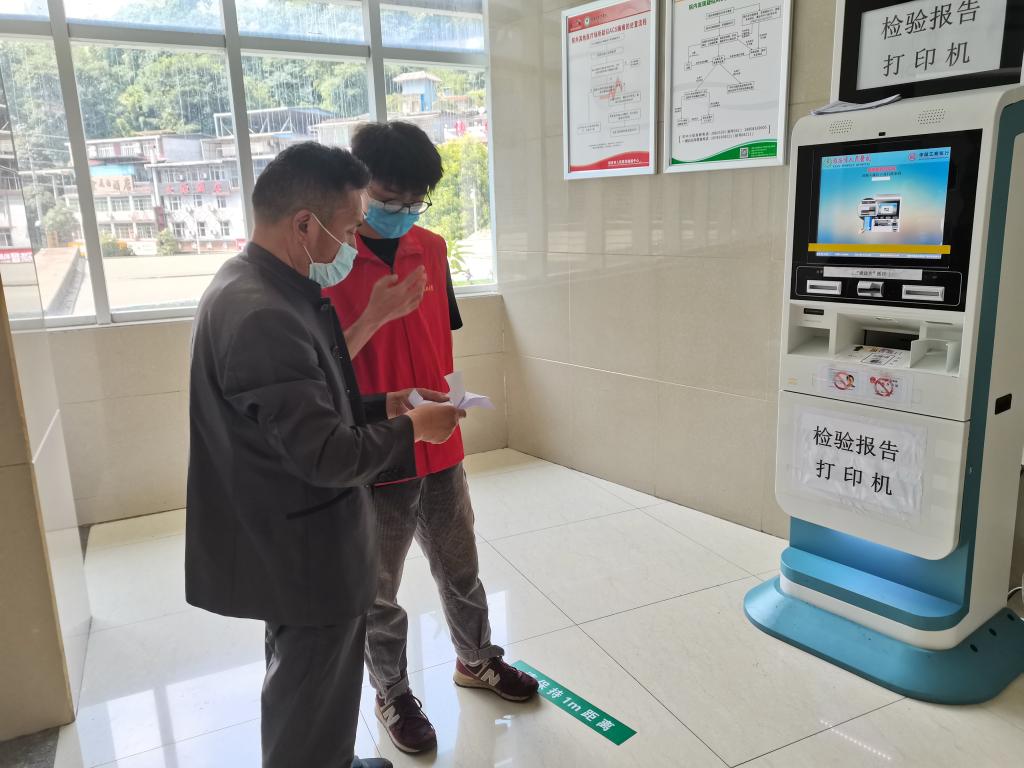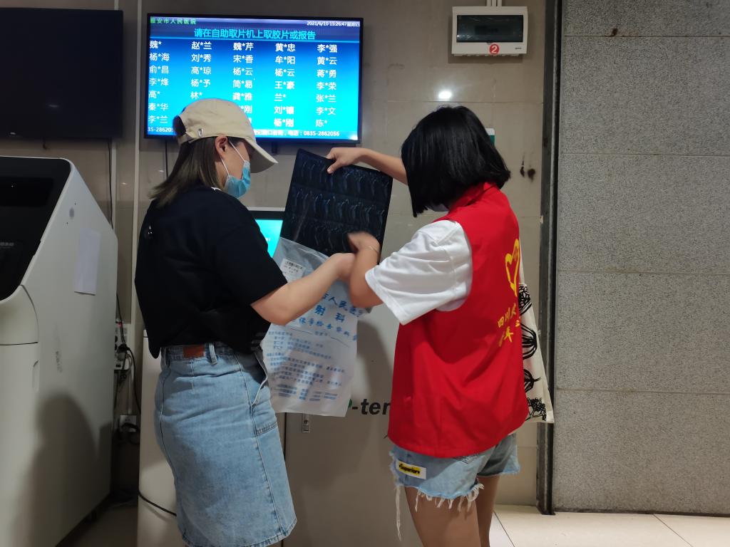 6名志愿者经过二十分钟的步行,提前到达目的地。随后,活动负责人为志愿者分配任务,两人为一组,分别进行帮助就诊患者在自助打印机上打印报告单、在自助打印机上打印CT胶片以及引导进入医院的病患及其家属的三个工作。帮助患者快速完成自己的诊疗过程。