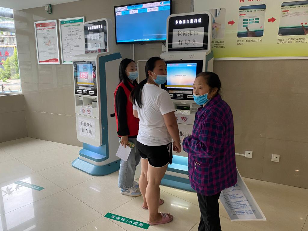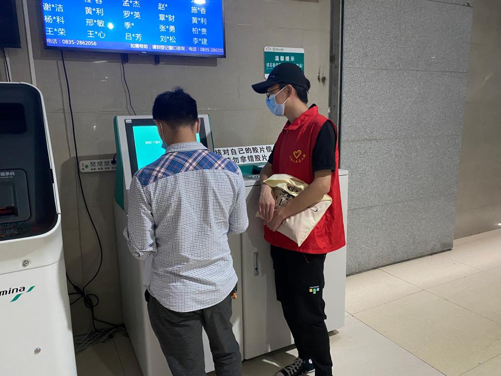 下午两点半,六名志愿者准时到达雅安市人民医院开展活动。此次志愿活动将队员分为三组,于医院的一楼和二楼开展活动,分别进行导医导诊、打印报告单和门口引导服务。全程共计三个小时,志愿者们积极协助患者相关事务,方便患者就医,帮助医护人员减轻工作压力。一楼正大门,两名志愿者仔细察看来院患者的天府通健康码与口罩佩戴情况,并耐心劝导未佩戴口罩的患者及时正确佩戴或前往就近药店购买一次性口罩。此外,他们还引导患者前往挂号地点。负一楼大厅胶片打印点,两名志愿者细心地为前来取报告单的患者提供打印帮助。二楼检验报告打印机,两名志愿者根据患者提供的相关信息协助进行打印,并作出相应答疑。哪里有人需要帮助,他们就会及时出现在哪里。