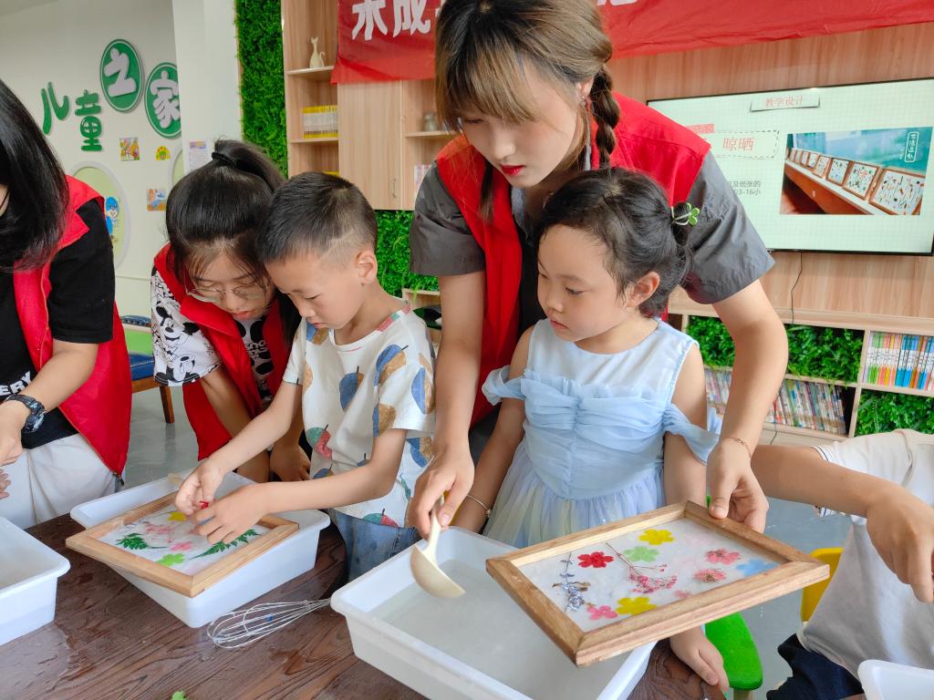 活动以社区老师讲解造纸术知识开始,随后8位志愿者分组帮助小朋友一起体验古法造纸。通过纸浆搅拌、抄纸、造型、二次浇浆、晾晒等步骤,小朋友们制作出了各式各样的精美花草纸。然后志愿者开展了防汛知识小课堂,以生动形象的话语向小朋友们讲述了什么是夏汛,夏汛的危害以及有效防汛的方法和妙招。最后,志愿者通过向小朋友们宣讲党史小故事来帮助他们理解和学习先辈们坚贞不屈、英勇顽强的崇高品格,激发他们的爱国情怀和民族自豪感,更好地传承红色精神。这次的党史教育让小朋友们知道了如今幸福生活的来之不易,让他们明白了要更加珍惜现在的生活,要好好学习,将来报效祖国。