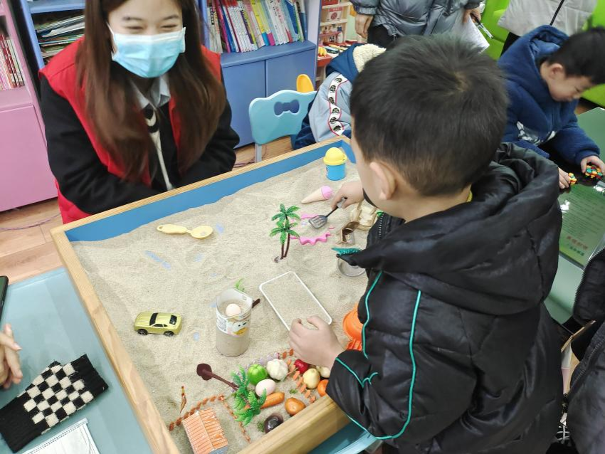 活动现场,志愿者们在上课前同小朋友们一起做游戏以此来拉近距离。