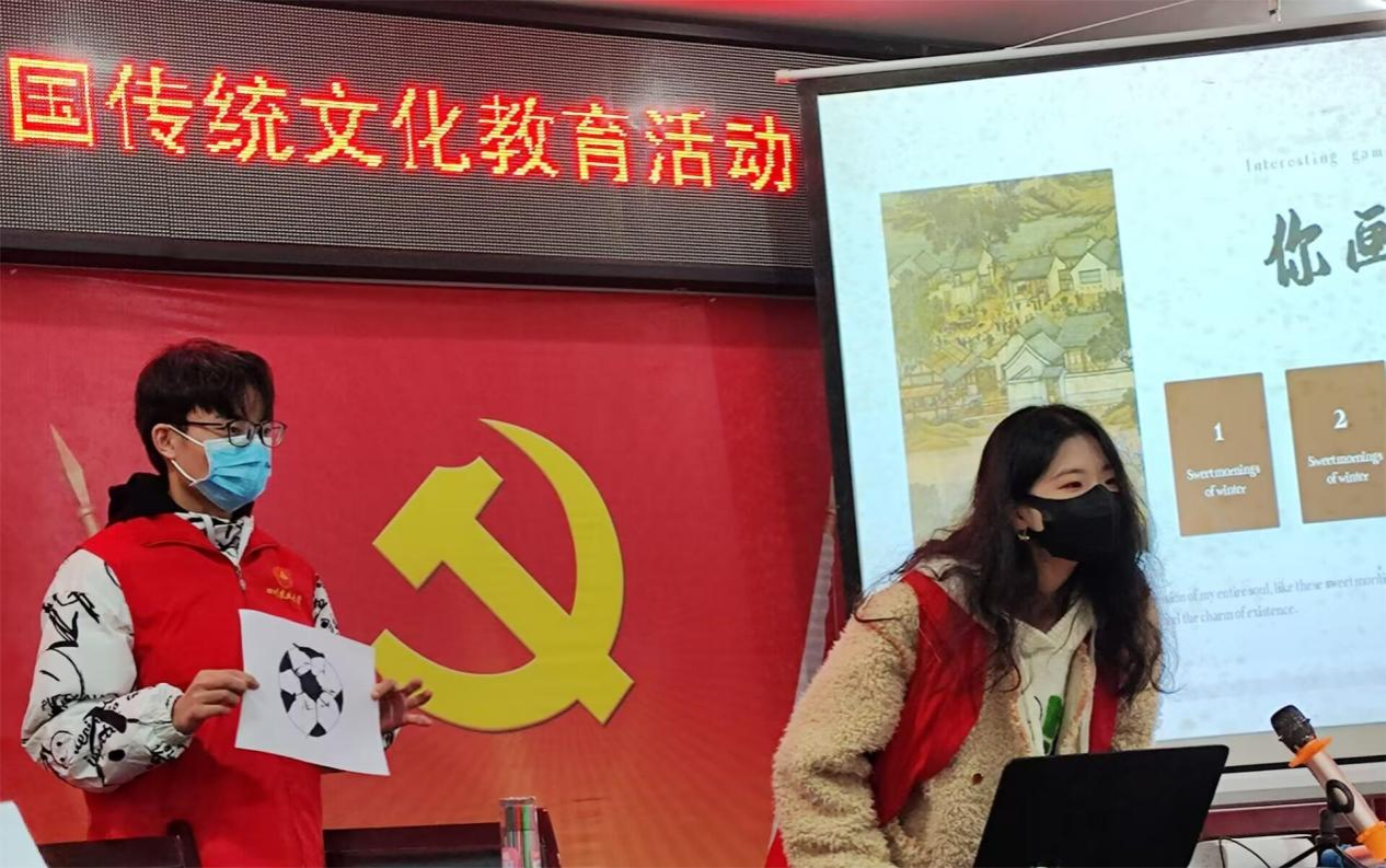 课堂上,志愿者们通过“你画我猜”小游戏活跃课堂气氛,并以一张足球的简笔画,引出课堂主题。
