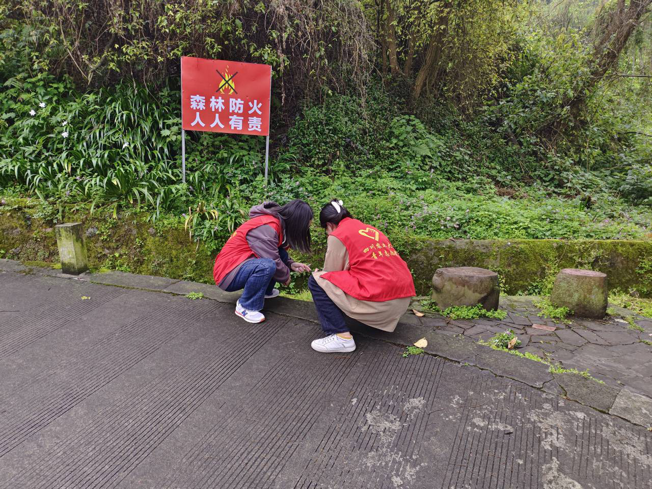 活动于早上10:00开始,参与其中的20名志愿者分成几个小组,手持垃圾袋,沿着山路向老板山行进。沿途志愿者们都积极而又细心,发现了许多遗弃在路边或半埋在土里的大大小小的垃圾。志工部部长们以身作则,在湿漉泥泞的半坡间、沟道里收集白色塑料;其他同学也积极参与,不断发现路边草丛里遗弃的纸张,食品包装袋等。