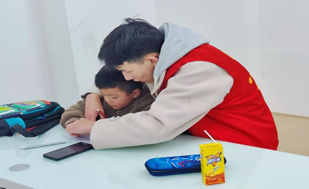 (图为志愿者为一位留守儿童辅导家庭作业)