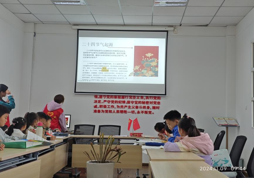 9日上午,志愿者们提前到达社区准备,等待小朋友们的到来,宣讲活动于9:30正式开始。主讲人蒋雷茜和杨雨欣首先了解了小朋友们对二十四节气文化的了解程度,随后有针对性地讲解二十四节气的起源及其所蕴含的深刻含义。蒋雷茜介绍道,二十四节气是基于古代人民对太阳周年运动长期观察的结果,它精准概括了一年四季的变化规律,被誉为“中华文明的第五大发明”。在讲解过程中,主讲人穿插相关诗词或视频,由浅入深地带领小朋友们认识二十四节气文化,领悟其文化内涵,现场的孩子们认真听讲,展现出浓厚的兴趣。