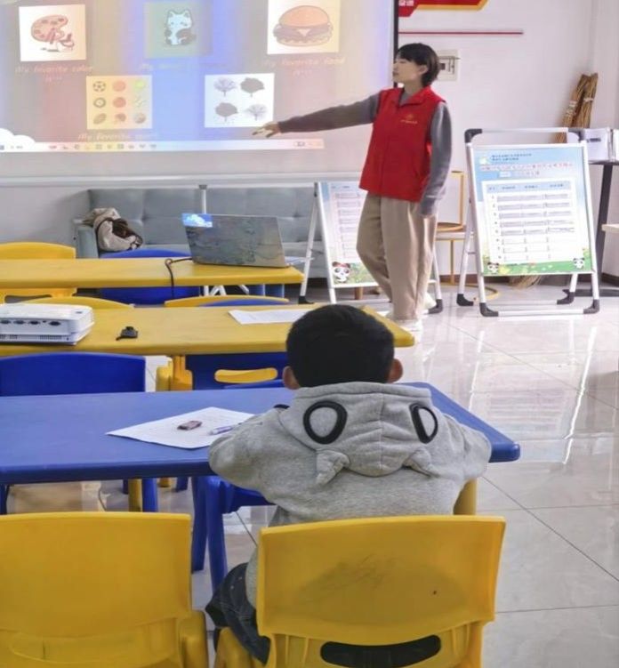 当日上午 9 时,志愿者团队准时抵达多营社区活动中心,迅速完成活动场地布置、教学设备调试及教学资料分发等准备工作,确保活动按计划有序开展。活动伊始,志愿者团队结合小朋友认知特点,采用 “小猪佩奇” 动画视频作为教学导入载体,有效激发了小朋友的学习兴趣,不少小朋友主动跟随视频内容模仿发音,为后续教学奠定良好基础。