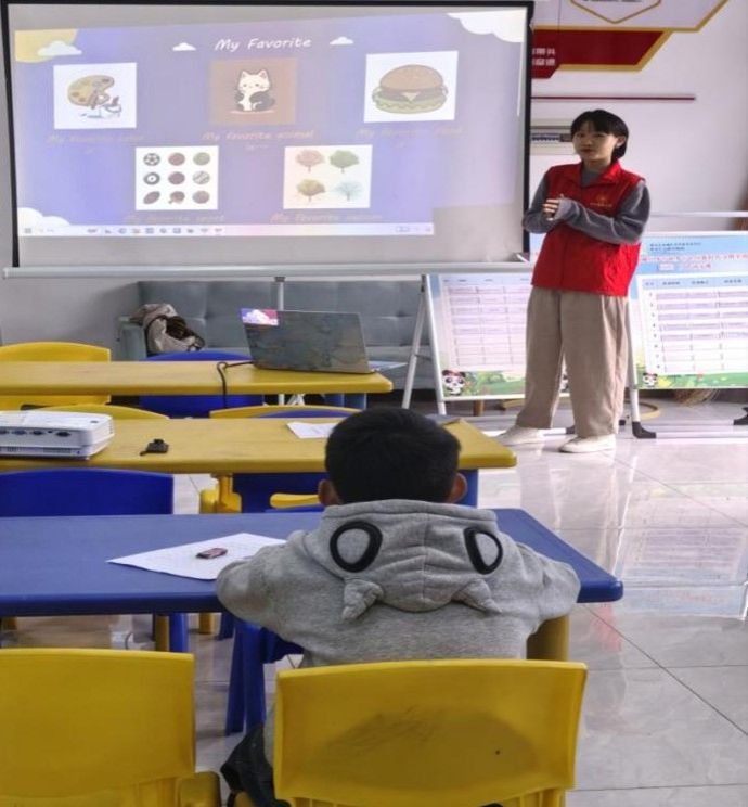 在核心教学环节,志愿者以 PPT 为主要教学工具,围绕 “姓名、年龄、最爱物品、兴趣爱好、家庭情况、未来梦想” 六大模块,通过图文结合的方式呈现核心英语词汇与句型,并搭配 “小猪佩奇” 动画中的经典场景案例,帮助小朋友理解知识点。同时,志愿者鼓励小朋友结合自身实际,尝试用所学英语表达个人情况,对表达过程中出现的问题及时给予指导,充分调动小朋友的参与积极性与表达意愿。
