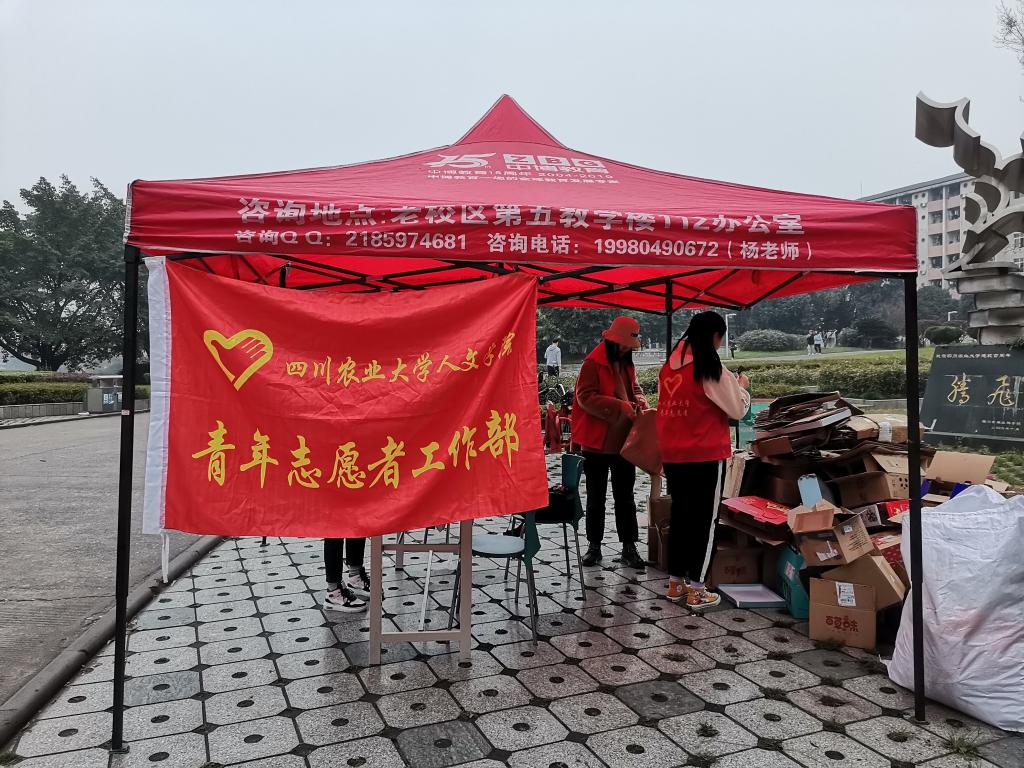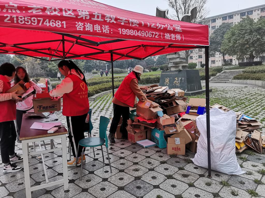 活动前期,太阳成集团tyc234cc团委志工部和英语201902团支部进行了充分准备和广泛宣传,鼓励大家积极参与。“双十一”快递纸盒回收活动需要落到实处,活动期间,志愿者们在第三住宿区门口搭建帐篷,设置快递盒回收处,对同学们捐赠的快递纸盒称重并做好记录。志愿者们分工协作,高效有序地完成了拆封、整理快递纸盒,放置纸盒,并将其运往纸盒回收机构三大主要工作。活动后期,志愿者们用收纳的快递纸盒与回收机构进行交易,并将所得款项捐赠给公益机构。
