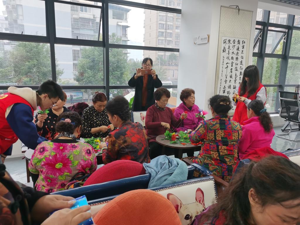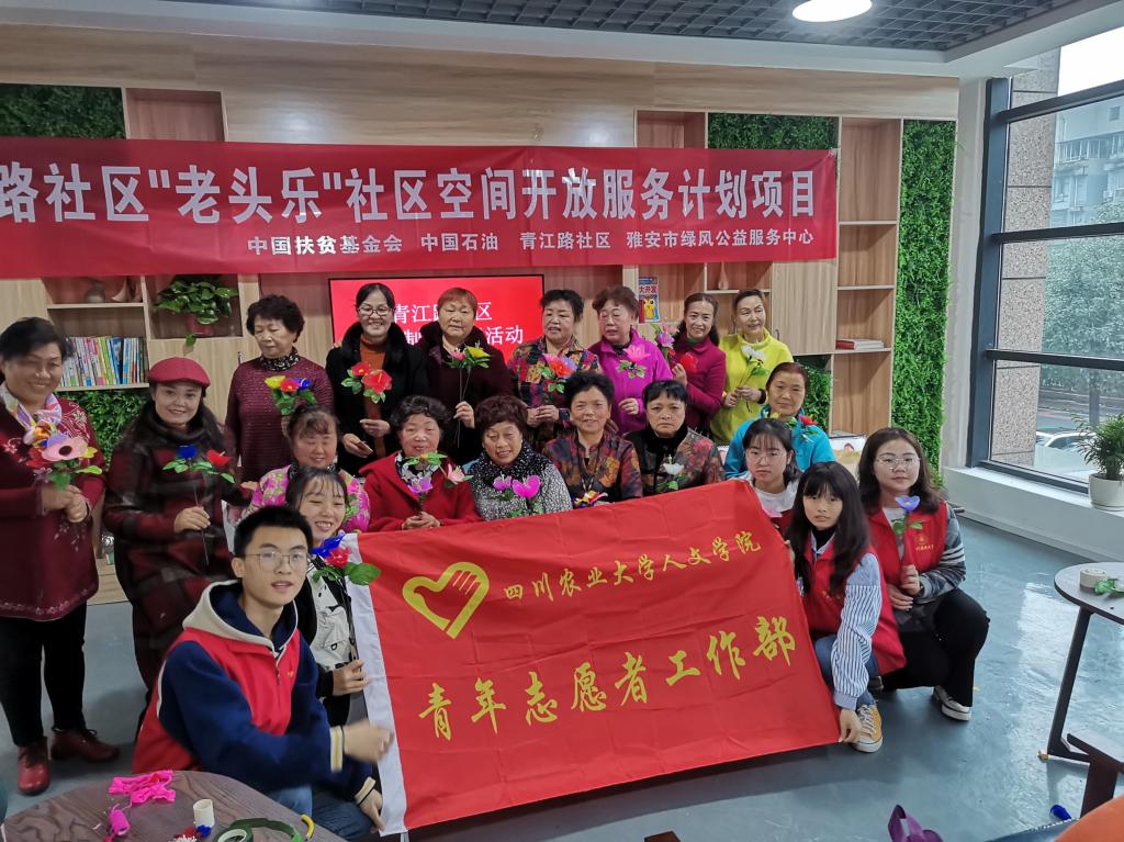 活动即将结束结束之际。老人们心满意足地握着手里的丝网花和志愿者们一起合影留念。临走时,老人们微笑着和志愿者道谢并表示希望以后还能与他们一起完成手工制作,志愿者们也微笑着和老人们道别。