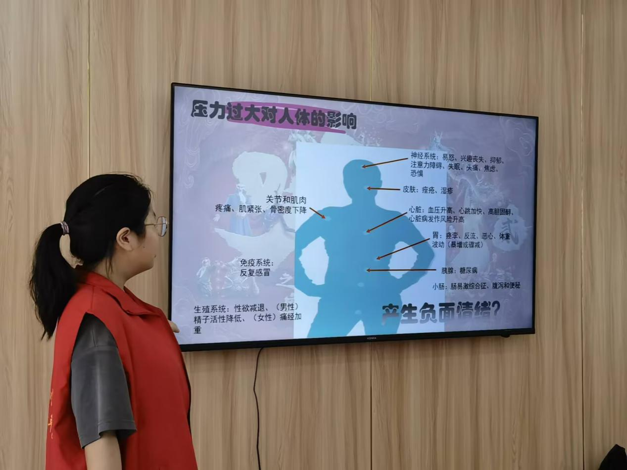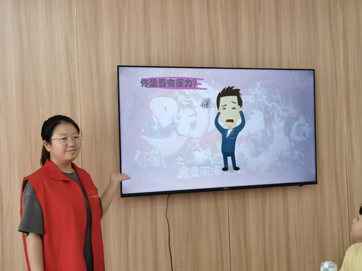 活动现场,团队成员以动画形象的PPT为载体,结合生活案例向孩子们解释压力的概念与表现。宣讲内容严格参照青少年心理发展特点设计,将“压力反应”具象化为“情绪小怪兽”“身体警报灯”等儿童易理解的比喻,并通过一系列活动引导孩子们表达内心感受。