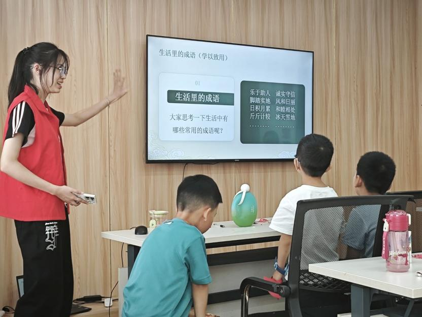 首先,队员们准备了剪纸材料与成语课程游戏,进行剪纸教学与玩法示范。随后,队员一边示范剪纸技法,一边讲解“美丽窗花”的民俗寓意,让孩子们了解剪纸的文化内涵,助力这项非遗技艺的传承。接着,队员进行成语故事小剧场环节,通过播放成语小故事,各种连环图画,生动展示狐假虎威、亡羊补牢等典故;孩子们则通过看图猜成语和成语接龙游戏,在竞技中理解“画龙点睛”的妙笔、“坐井观天”的局限。