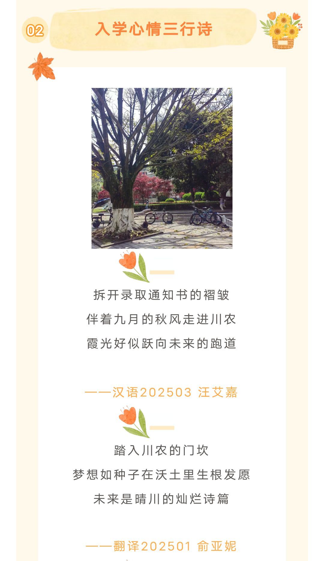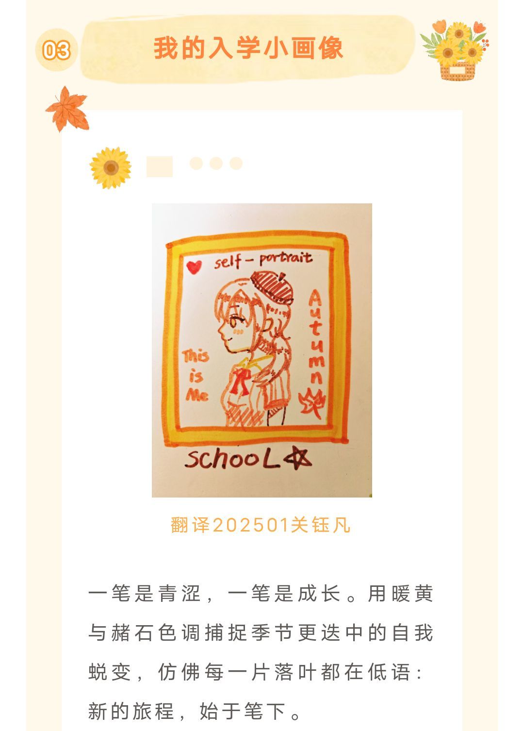 活动自8月26日启动以来,受到新生的广泛欢迎和积极参与,截止目前,共收到作品百余份,远超预期。同学们通过诗歌和绘画多元呈现初入大学时的情感体验与心理状态。有同学在诗中写道:“行李箱滚过晨曦的走廊,我的心跳与门牌号轻轻重合”,表达了对新生活的期待与忐忑;还有同学通过画笔勾勒出“背着书包仰望校门的自己”,并写道:“这里不仅装着书本,更承载着我未来的梦想”,真挚动人地记录下成长瞬间。