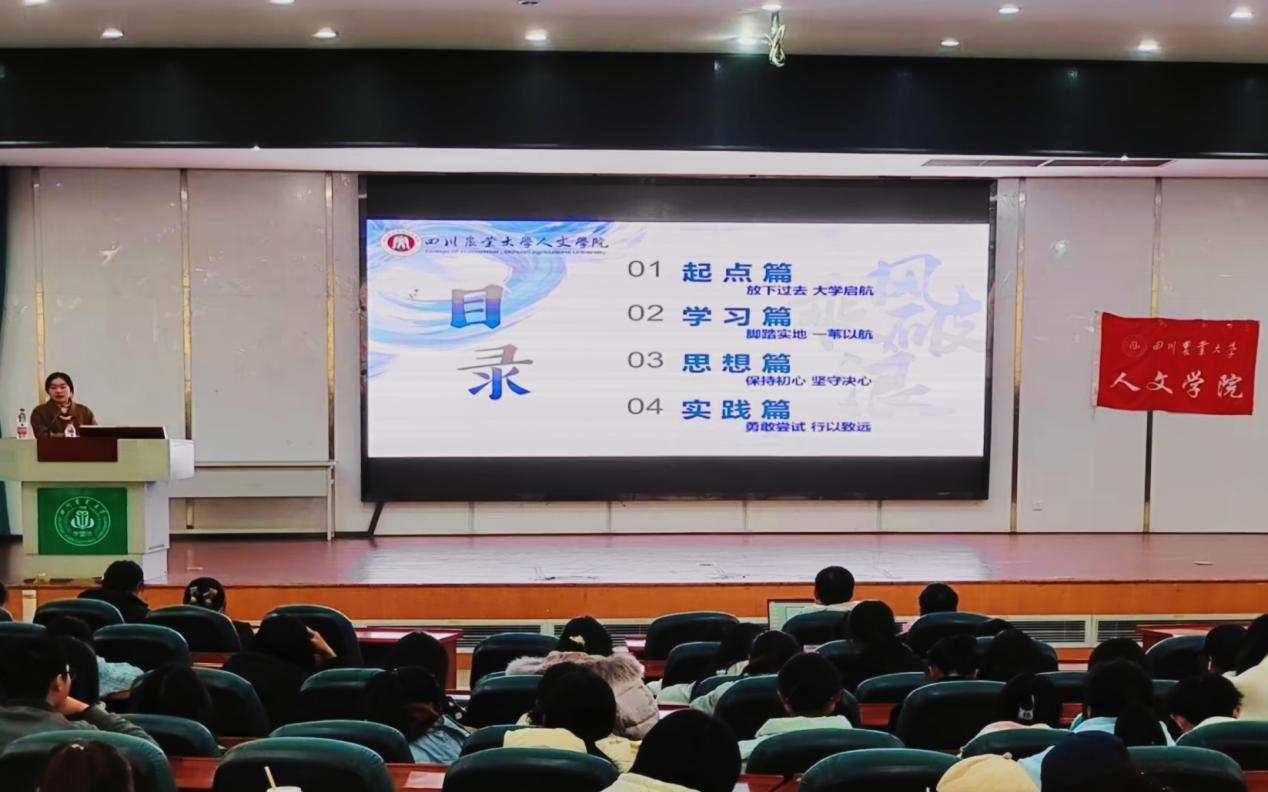 罗欣如先以两个问题“为什么来川农”“你适应老员工活了吗”为引入点,并强调无论过往如何,面对大学的新起点都应放下过去,开启大学新篇章。随后,她向同学们展示了相关奖项证书,并分析了专业课程相关信息,意在引导同学们合理安排学习计划、制定清晰的目标、脚踏实地投身学习工作。其次,罗欣如向同学们阐述了个人入党经历,表达了不忘坚持跟党走的初心。她认为我们当代青年应不忘初心跟党走,鼓励同学们积极入党、学习党的先进理论思想并在工作中积极实践。“学会记录、学会自洽、学会总结”是她对各位同学的建议。最后,罗欣如还强调同学们要积极参与志愿服务与社会实践以锻炼自己的交流沟通能力、提高工作能力。