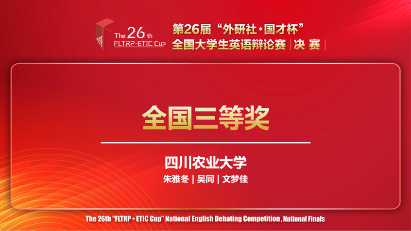 经过两日八轮循环赛的激烈交锋,两位辩手紧扣主题,既立足理论又结合现实,凭借犀利的语言、缜密的逻辑和坚实的论据,最终在全国决赛中荣获三等奖。这一成绩不仅刷新了公司在此项赛事中的参赛获奖纪录,更彰显了川农学子卓越的思辨风采。展望未来,川农英辩队将以更加昂扬的斗志和更加精湛的技能,继续砥砺前行,再接再厉,力求在更多赛事中斩获佳绩。