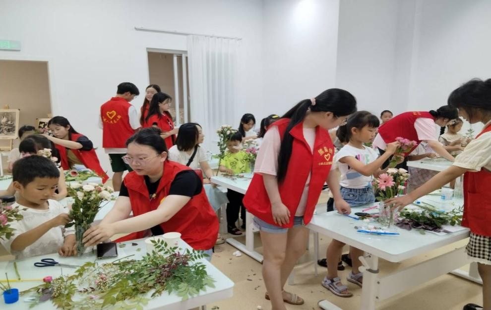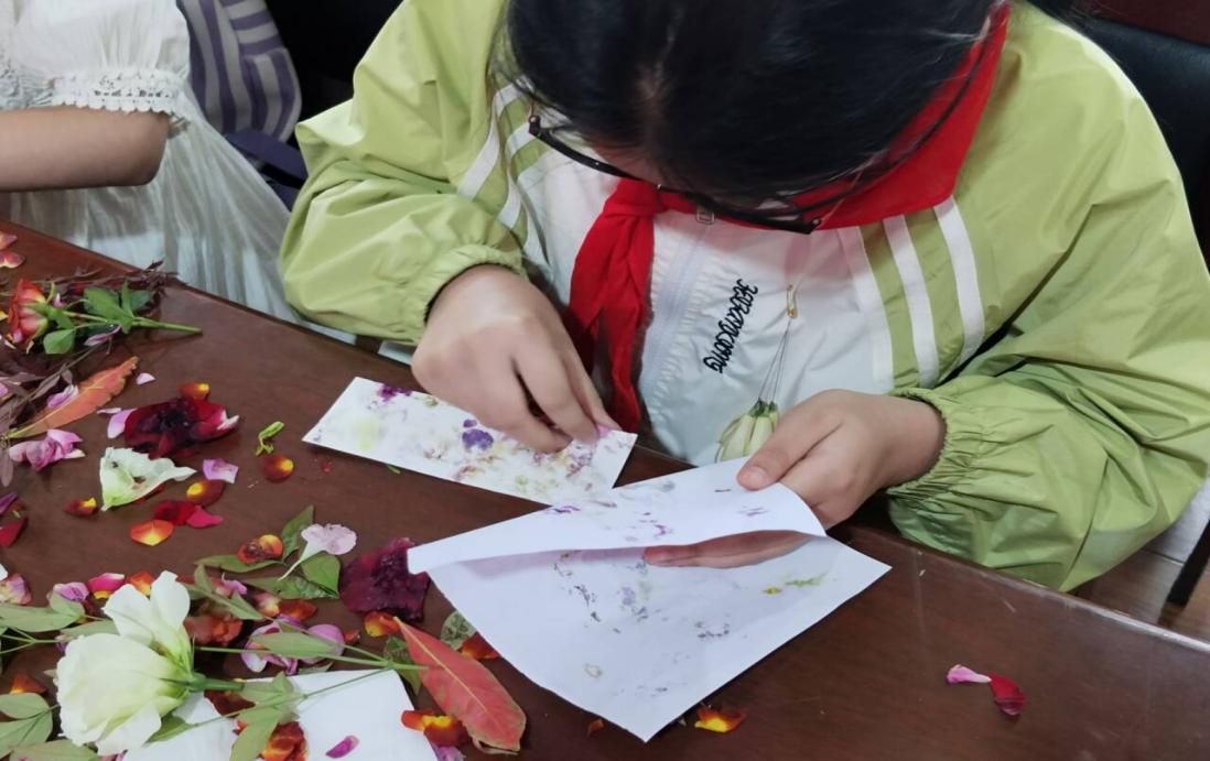“以花为友”艺趣插花环节中,在志愿者的指导下,小朋友们学习了基本的插花技巧,并尝试创作属于自己的花艺作品。捣叶、浸水、拓印……他们植物印染纸上,感受植物的质地和生命力,将自己的情绪随着捣染的过程逐渐释放出来。在此过程中,小朋友们可以感受自己内心情绪的变化,静神养心,进行自我调节。