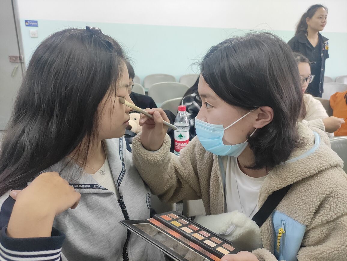 本次美妆计划以精致实用的眼妆塑造为主题,分为底妆、眼妆和睫毛三个部分。活动伊始,主讲人田宇淇介绍了底妆的三个注意事项:一是妆前补水保湿,二是怎样选择粉底色号,三是遮瑕的使用方法;同时,主讲人还给同学们分享了一些保持妆面持久的实用干货。在眼影环节,主讲人先介绍了眼妆风格和颜色的选择,随后对眼妆技巧进行了详细的介绍。同学们在仔细观摩主讲人给模特上好底妆后,四人一组进行底妆练习,主讲人及工作人员近距离地和每个小组进行了交流讲解和操作示范,方便同学们更好地理解所讲内容,画出一个精致的妆容。