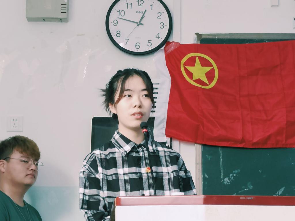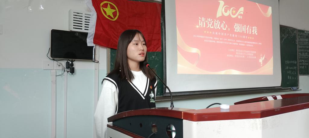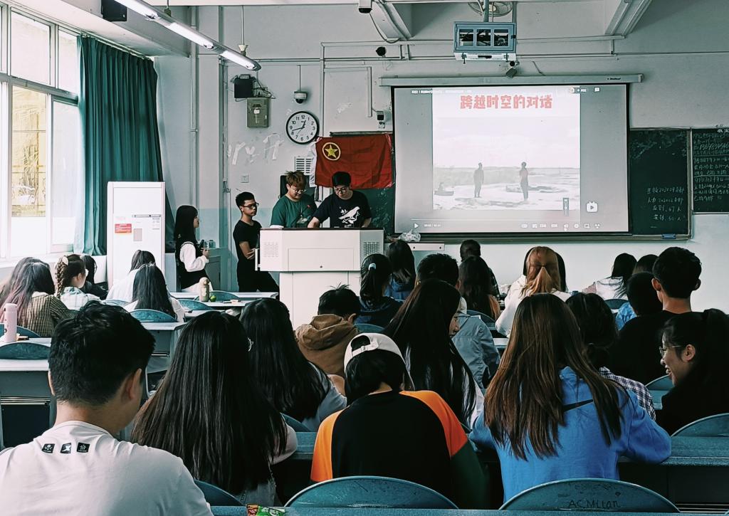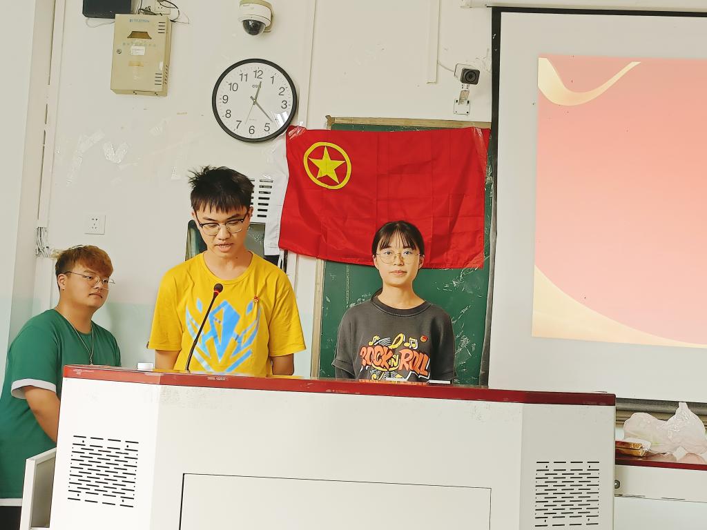 活动开始之时,在两位主持人宣布活动开始并介绍出席嘉宾后,全体同学齐唱团歌。激昂的歌声在宽敞的教室中回荡,所有同学积极融入活动当中,现场气氛非常活跃。歌声暂歇,活动继续进行,由两位同学播报国内外近期重大新闻,加深大家对国家和社会的联系。随后,主持人组织观看视频回顾习近平总书记在庆祝中国共产党成立100周年大会上的讲话。“我们实现了第一个百年奋斗目标,在中华大地上全面建成了小康社会……”习近平总书记的声音娓娓道来,这些都是中国共产党带领人民开辟的伟大道路、取得的伟大成就。身处伟大新时代,是吾辈之荣幸。接着,由优秀团员代表以讲授微团课的形式将学习“七一”重要讲话与贯彻习近平总书记关于学习和总结党的历史的重要论述结合进行专题辅导。让同学们铭记:我们身处伟大的新时代中,要牢记初心与使命,追梦脚步永不停歇。