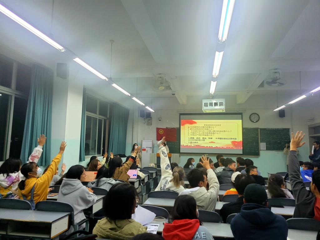 下午6点20,同学们相继完成活动签到,振奋人心的国歌与团歌响起在十教717的教室。同学们铿锵有力的歌声,隆重揭开了活动的幕布。