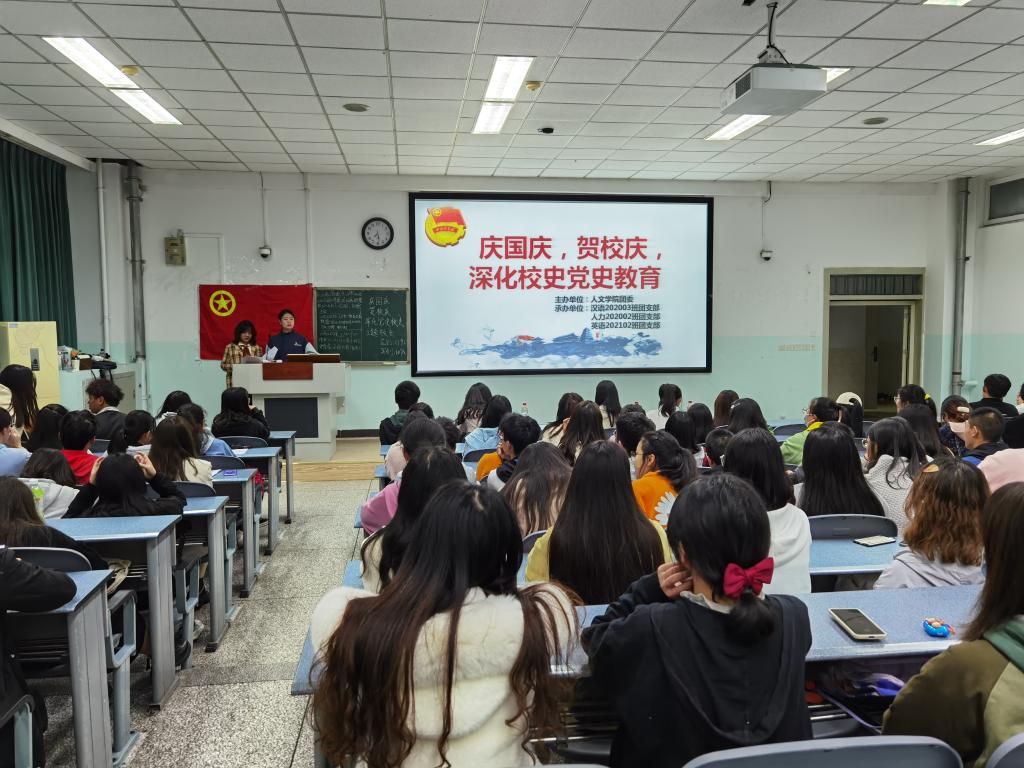 在2021年建党一百周年、建国72周年以及建校115周年的特殊日子里,为深化党史校史学习,进一步激发同学们敬党、爱国、爱校的情怀,10月22日晚,人力资源管理专业202002团支部、汉语202003团支部以及英语202102团支部在10-A301联合举办了以“庆国庆,贺校庆,深化党史校史教育”为主题的团日活动。