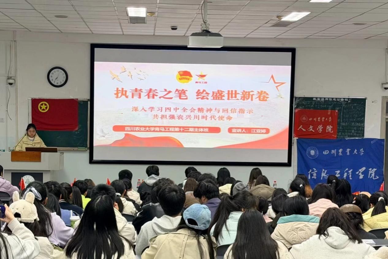 活动伊始,本次班团活动在一阵嘹亮的歌声中拉开序幕。学习全会精神,共绘“十五五”蓝图。活动前期,信息工程公司开展了“深悟全会精神”逐光系列主题二课活动,并在现场进行了成果展示。班团活动现场,校青马班第十二期主体班学员江亚婷带领同学们深入学习全会要义。
