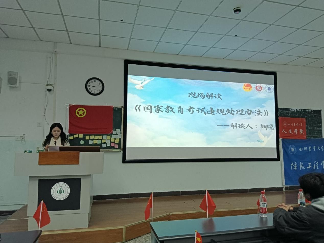 严明考风考纪,筑牢诚信防线。在这一主题下,现场播放小班成员拍摄的诚信考试警示片,信息工程公司团委副书记胡晓现场解读《国家教育考试违规处理办法》,主持人带领同学们进行诚信考试现场宣誓,以实际行动强化诚信意识。