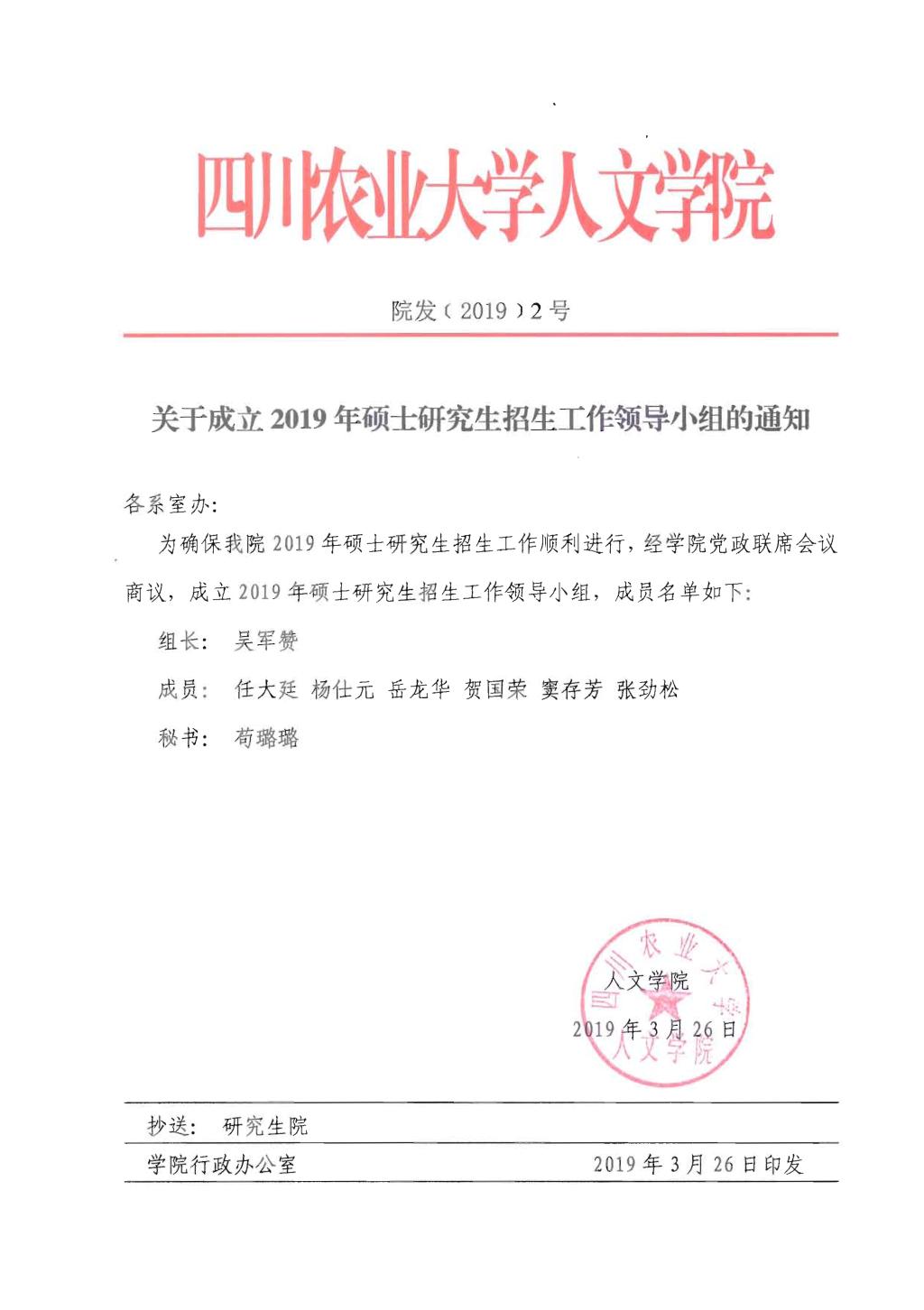 太阳成集团tyc234cc2019年硕士研究生招生工作领导小组(院(2019)2号)