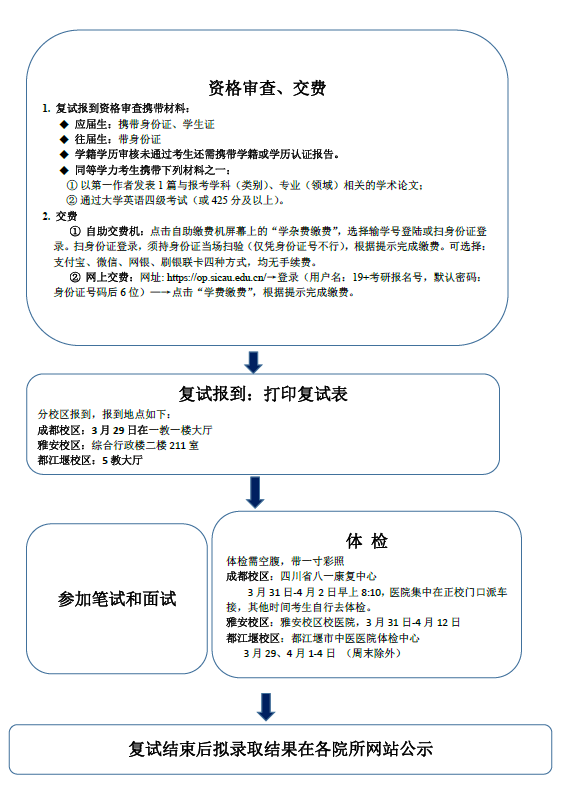 1.复试报到 2.资格审查 3.缴纳复试费 |