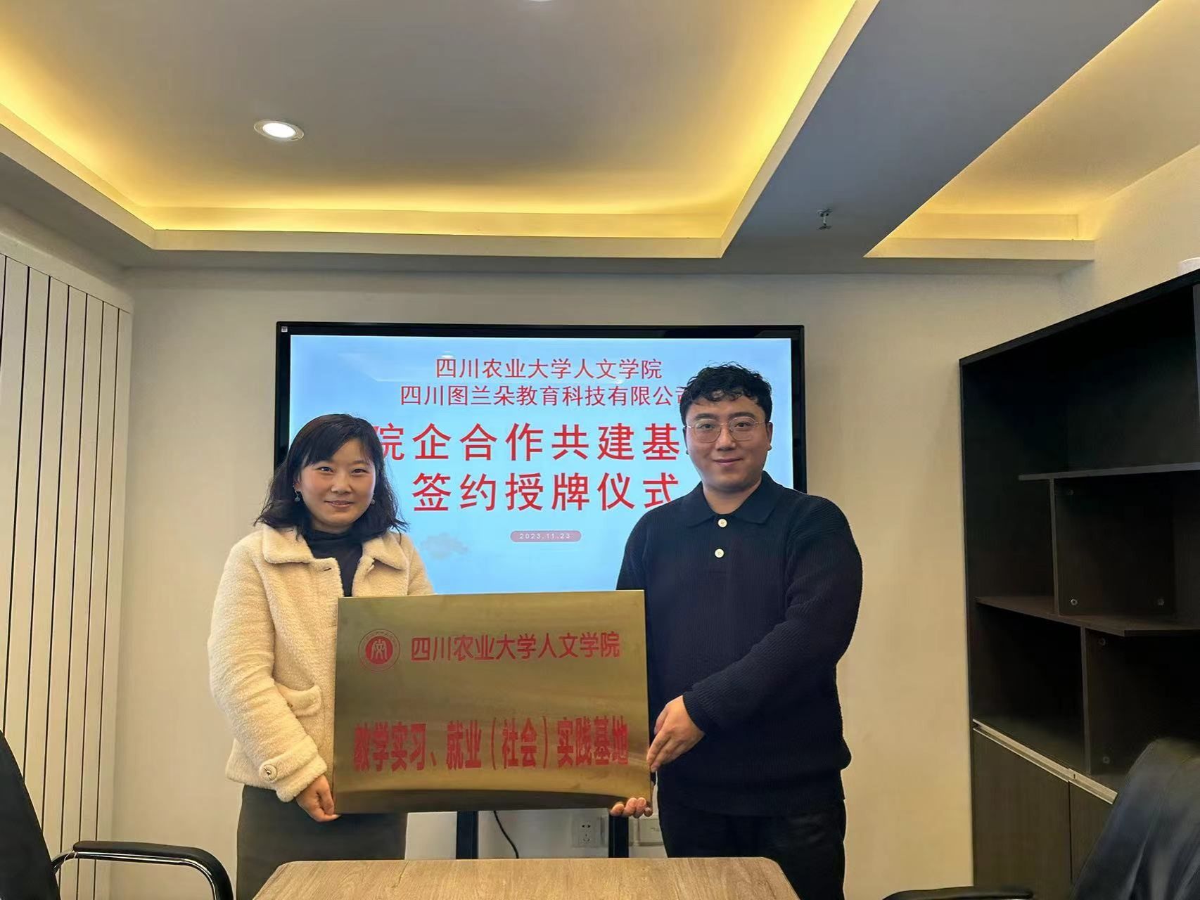 当日下午,陈俊霖一行前往四川图兰朵教育科技有限公司进行合作洽谈。座谈会上,该公司负责人王泽晗对陈俊霖一行表示了热烈欢迎,首先介绍了图兰朵教育的主要业务范围和目前汉语国际教育方面的合作需求。随后,中文系主任匡存玖就目前汉语言文学专业招收职工等方面的情况进行了沟通。双方就院企合作具体方式和实习岗位等问题展开了具体商谈,双方达成了初步的合作意向,并举行了授牌仪式。