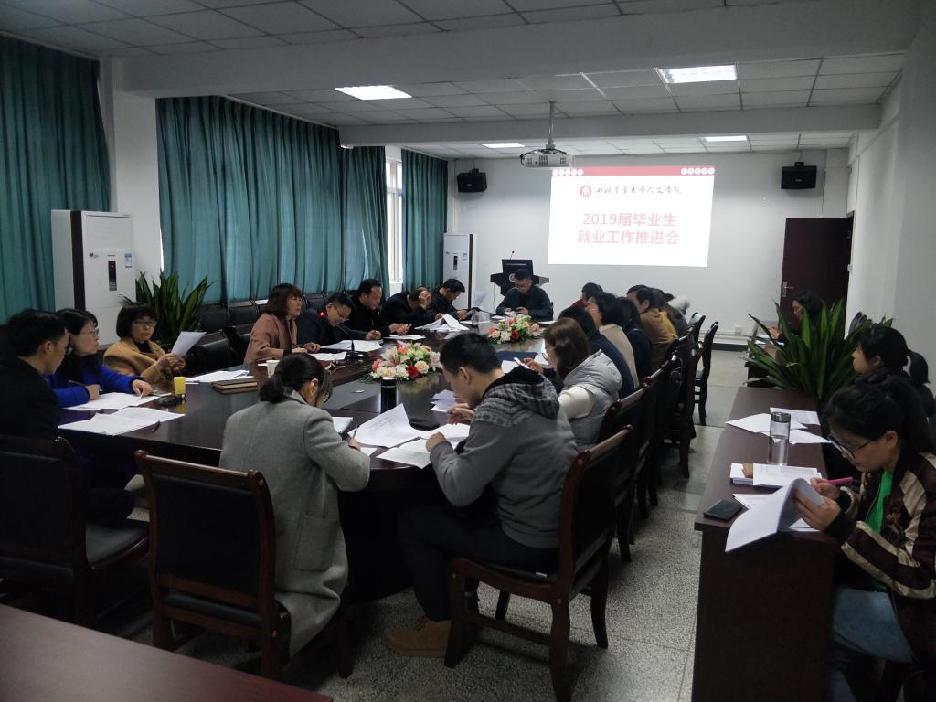 3月19日下午,2019届毕业生就业推进会在文法楼212召开。经理吴军赞、党委书记李清源、副经理任大廷、党委副书记杨仕元,各系系主任以及各毕业班班主任到场参加。会议由杨仕元主持。