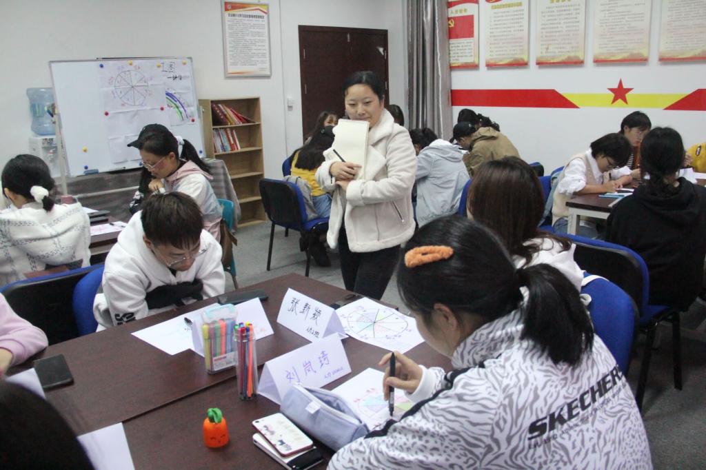 随后,陈俊霖协助同学们针对大学阶段的角色,动手制作个人的平衡轮。分享环节中,同学们按照自己对平衡轮各方面的理解和标准分析了多彩的个体差异性。同时,陈俊霖指导同学对比自已绘制的平衡轮与自我理想的平衡轮,从中找出差距并考虑实际情况,想出可行的解决方法。